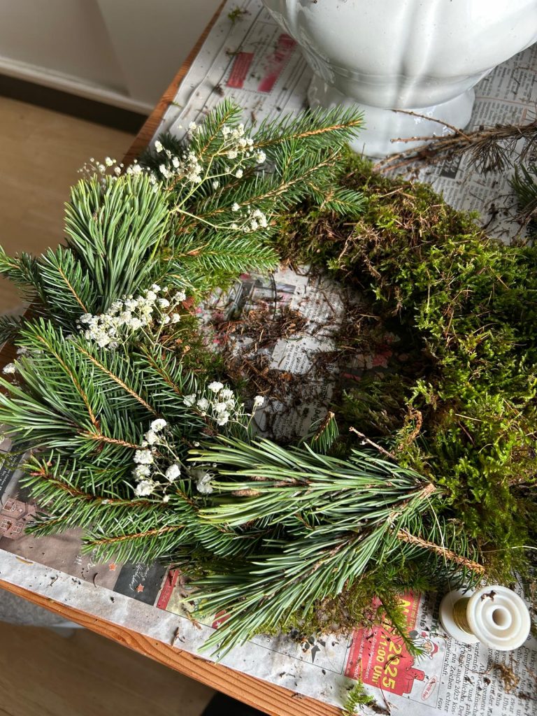 Also musste der Deckel eines alten Pizzakartons (wie gut wenn „Kinder“ mit im Haus wohnen) als Rohling herhalten. Den habe ich mit Moos dicht umwickelt , das gibt eine schöne Basis und verzeiht wenn die Wickeltechnik nicht perfekt ist. Abwechselnd habe ich Fichte und Kiefer aufgebunden und ein paar Blüten weißen Schleierkrautes mit eingebunden damit es nicht zu dunkel und trist wirkt. Auf den fertig bestückten Kranz kamen dann noch Lerchenzweige, die sich wunderbar biegen können und mit ihren Zapfen Lebendigkeit bringen.