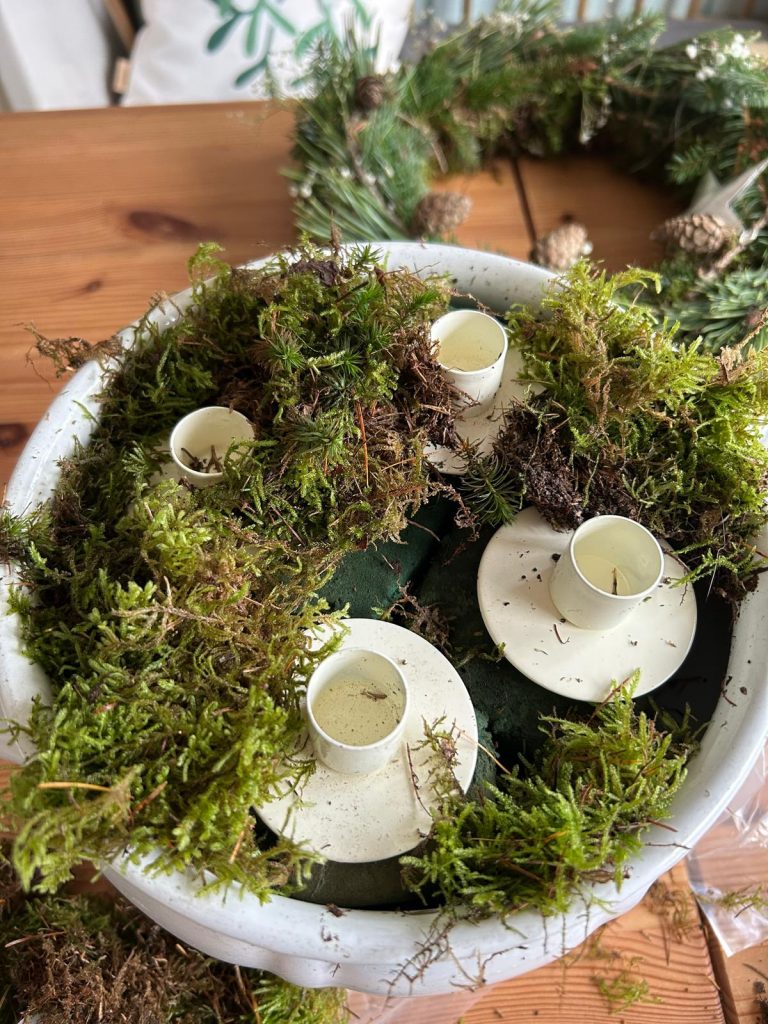 Nun musste eigentlich nur noch der Kranz auf den Rand der Terrine gesetzt und die Kerzen gesteckt werden. Für den täglichen Gebrauch habe ich ganz schnöde weiße LED Kerzen gewählt, bei uns zuhause mit Hunden, Katze und Enkeln sicher die sicherste Wahl, aber an den Sonntagen selber werde ich tauschen in echte Kerzen mit richtiger Flamme.