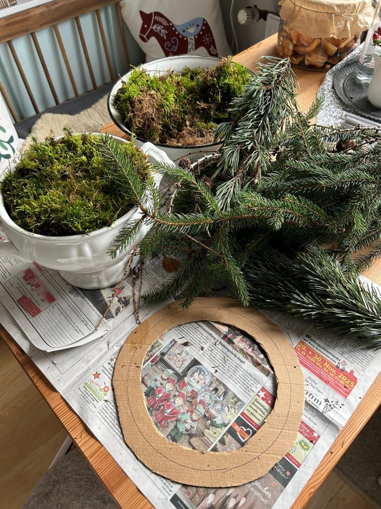 In der Fülle von Ideen die Instagram netterweise bietet, gefiel mir die Anregung den Kranz auf einen Pappring zu binden ungemein gut. Ein flacherer Kranz auf der hochbeinigen Terrine, das war perfekt.